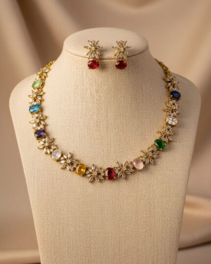 Luxury Multicolor Gemstone Floral Necklace & Earrings Set | Diamond-Inspired Gold Statement Jewelry | D&J Diamonds & Jewels