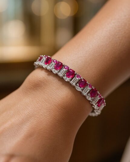 MJ Marukh’s jewels Ruby Red Emerald-Cut Tennis Bracelet in White Gold Finish