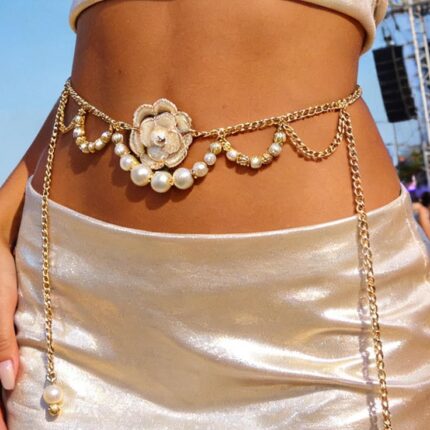 MJ Pearl Bloom Floral Waist Chain – Luxury Gold Body Jewelry Belt
