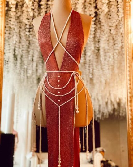 Scarlet Luxe Pearl-Draped Body Harness Gown