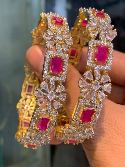 MJ Ruby Pink Luxury Zircon Bridal Bangles – Gold Plated Floral Statement Kada Set for Women