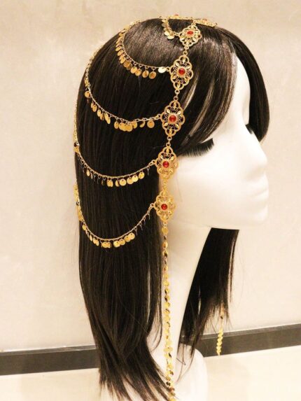 MJ Royal Ruby Cascade Hair Chain Headpiece – Gold Bridal & Festive Headdress