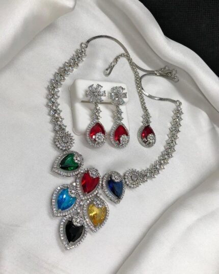 MJ Royal Multicolor Heart Crystal Statement Necklace Set with Matching Earrings & Bracelet