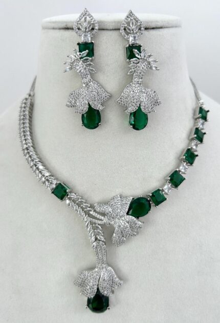 Emerald Bloom Luxury Necklace Set – White Gold Plated Green Stone Statement Set