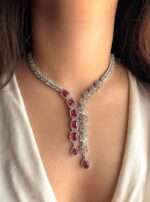 Elevate your wedding and party style with the D&J AMIE Red Diamond-Look Necklace , designed to deliver luxury without compromise. Adorned with sparkling faux diamonds and rich ruby-red stones, this stunning set is finished in white gold rhodium plating for a radiant, long-lasting shine. Perfect for Indian weddings, proms, and glamorous occasions, this piece reflects timeless elegance, premium craftsmanship, and bold sophisticati
