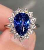 An extraordinary natural GIA-certified 5.02 CT pear-shaped blue sapphire, mined in Ceylon (Sri Lanka) and 100% unheated, showcasing a deep navy-blue hue with vivid saturation and a luminous, reflective brilliance. The sapphire is perfectly clean and precision-cut to maximize fire and elegance.