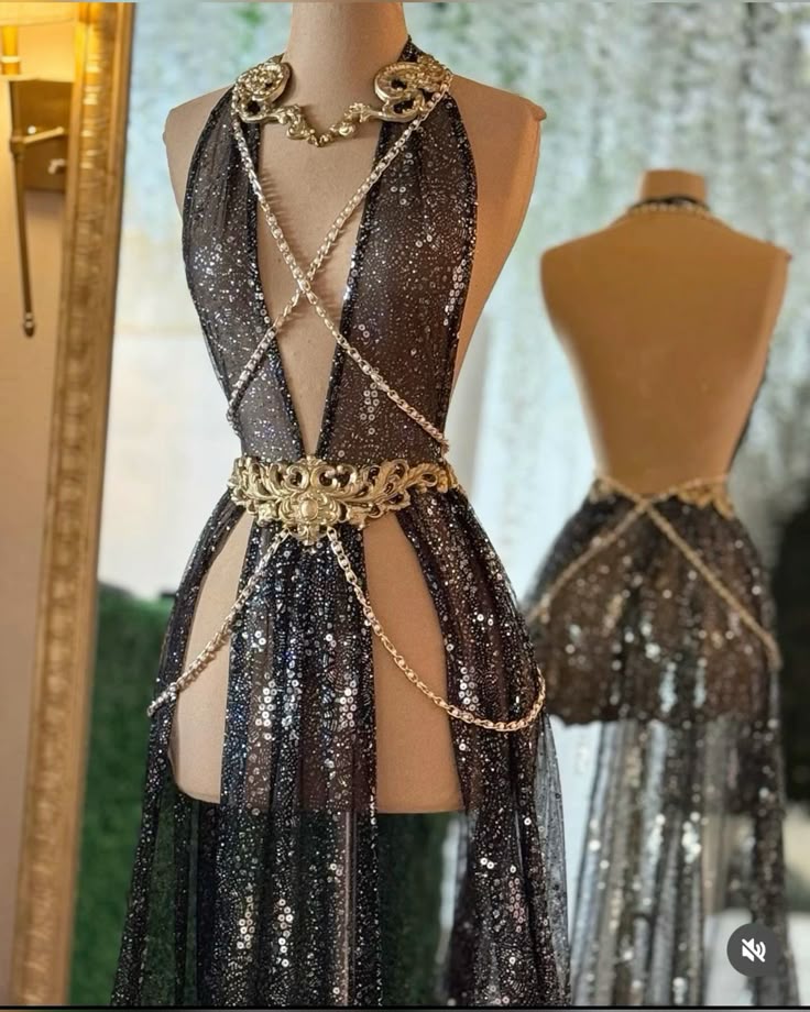 Featuring intricately detailed shoulder medallions and a lavish central waist ornament, the design flows into delicately crossed chains that frame the torso with architectural precision. The layered chains drape effortlessly over the body, enhancing movement while adding depth, drama, and undeniable glamour. Each element is carefully balanced to complement bold eveningwear, sheer gowns, or statement couture looks.