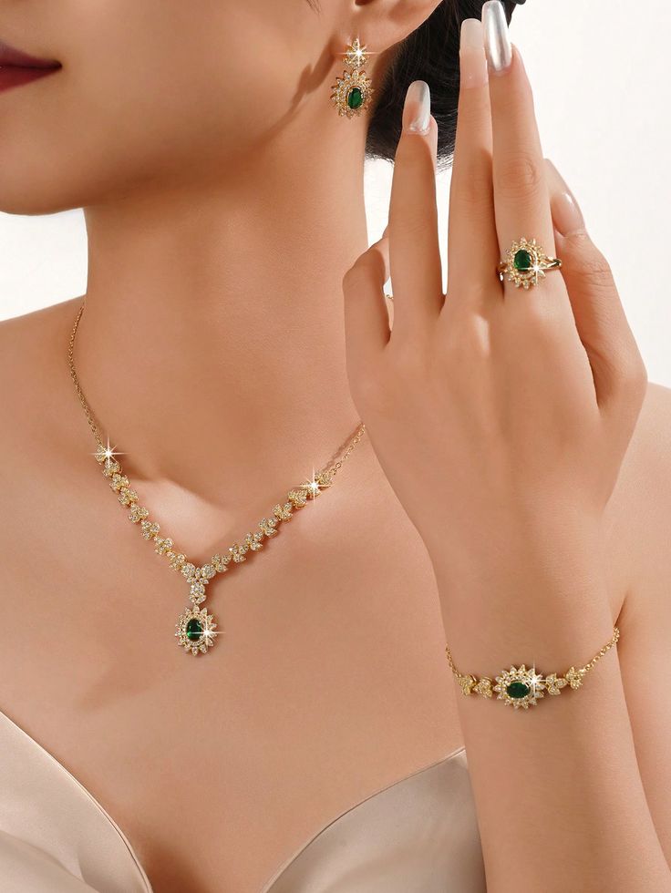 This exquisite collection features vivid emerald-green center stones framed by dazzling crystal halos, all set in a radiant gold-tone finish. The delicate necklace is adorned with shimmering crystal accents that gracefully lead to a striking emerald pendant centerpiece, creating a perfect balance of sparkle and sophistication.