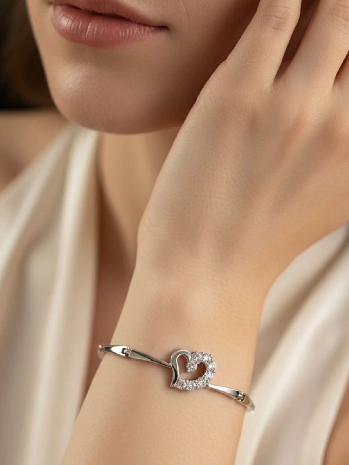 The sleek white gold-tone band enhances the sparkle of the heart motif while maintaining a minimalist and contemporary silhouette. Its open cuff design ensures a comfortable and flexible fit, making it perfect for daily wear as well as special occasions.