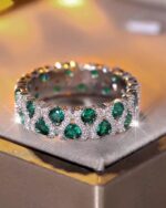 Designed with brilliance in every detail, this luxurious band features two dazzling rows of vibrant round emerald-green stones, each encircled by sparkling halo accents. The full eternity design symbolizes everlasting elegance, making it perfect for weddings, anniversaries, engagements, or glamorous evening wear.