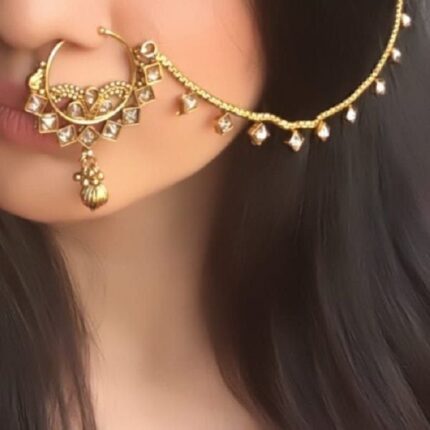 Its lightweight and secure design makes it ideal for everyday wear while still being eye-catching enough for special occasions. Whether styled with traditional attire or modern outfits, this nose stud adds a refined statement without being overpowering.