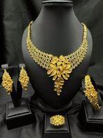 The beautifully crafted necklace is complemented by matching floral earrings, elegant bangles, and a statement ring — making it a complete bridal and festive ensemble. The textured leaf detailing and shimmering accents add depth and brilliance, ensuring you stand out at weddings, receptions, engagements, and grand celebrations.