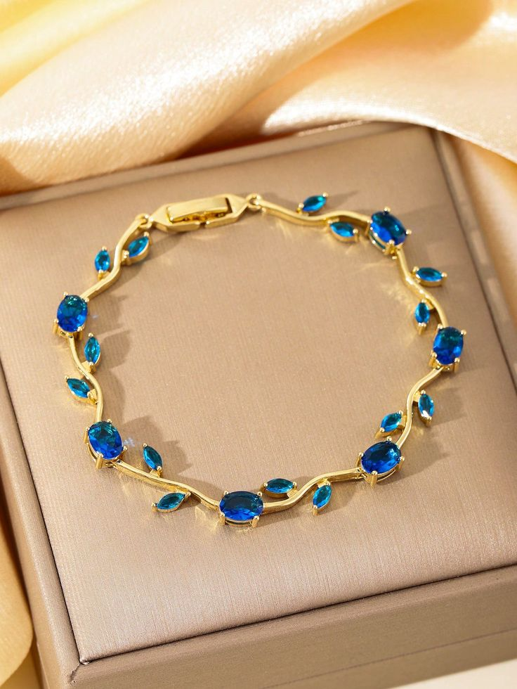 This exquisite design features a harmonious arrangement of oval-cut and marquise-cut blue sapphire-toned gemstones, gracefully set along a flowing gold-tone link structure. The rich ocean-blue stones shimmer with brilliance, creating a dynamic play of light that captures attention with every movement.