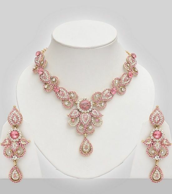 This luxurious set features an intricately crafted gold-tone necklace adorned with shimmering pink crystals and sparkling clear stones. The ornate floral and scrollwork design creates a regal silhouette, while the central teardrop pendant adds elegance and movement. Paired with matching chandelier earrings, this set delivers a complete statement look perfect for special occasions.