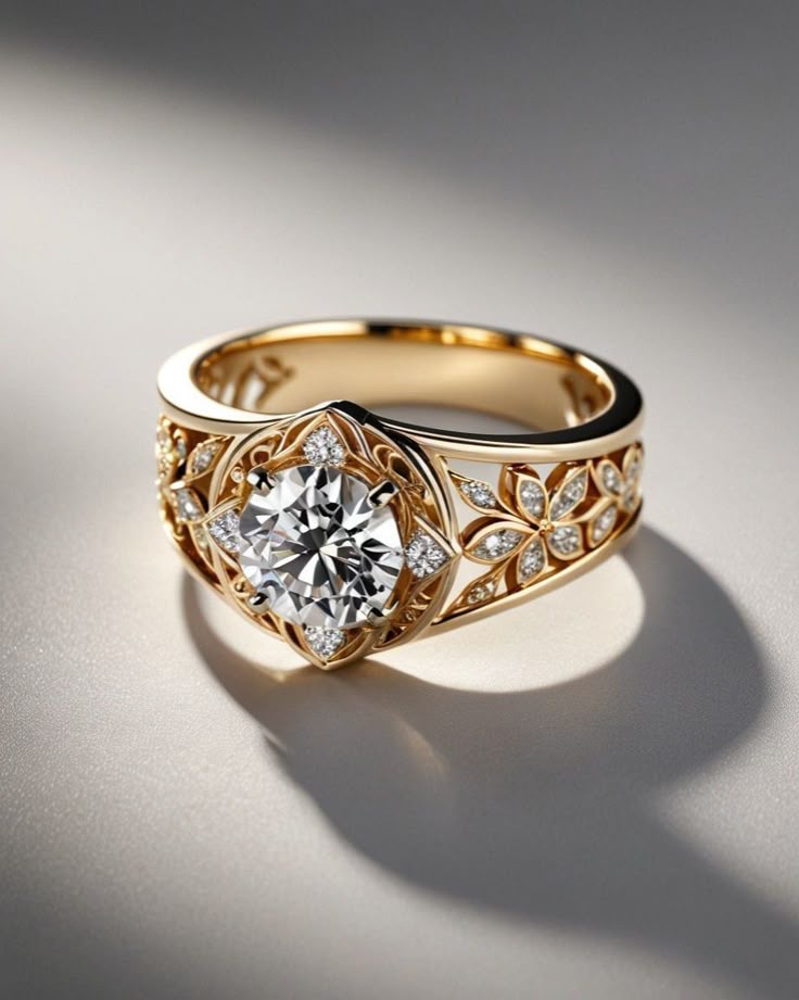 Introducing timeless elegance with a vintage touch — the Vintage Floral Solitaire Ring from D&J Diamonds & Jewels. This exquisite piece features a brilliant round-cut center stone secured in a unique floral-inspired geometric setting that enhances its sparkle from every angle.