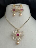 The matching earrings mirror the pendant’s intricate design, featuring the same ruby-toned centerpiece, dazzling stone accents, and elegant pearl drops for a perfectly coordinated finish.