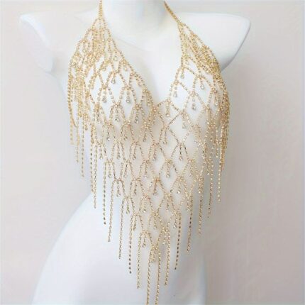 Turn every entrance into a statement with our Scarlet Luxe Pearl-Draped Body Harness Gown. This breathtaking piece features a shimmering deep-red plunge silhouette adorned with cascading pearl chains that sculpt and accentuate the body with elegance and drama.